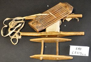 Zwei am unteren Ende abgeknickte Holzleisten. An diesem Ende beide mit Messsingbeschlag und mit Metallzähnen (4 + 6) versehen. Teil a mit Holzriegel um einen Holznagel drehbar, 3 weitere Bohrungen und teils Riegelspuren vorhanden. Teil b mit 6 Kerben an der Innenseite und Schlitz auf der Rückseite. Beide Teile mit eingepunzten Ringformen verziert (Loch im Zentrum) und mit eingestochenen Wellenlinien. Auf Teil b eingeschnitztes Monogramm: HF. R B. Auf Teil a eingestochenes monogrammartiges Motiv, unleserlich. Die beiden Teile müssen irgendeine bewegliche Verbindung gehabt haben und durch einstechen in die Gewebekanten, diese in der geplanten Breite auseinandergehalten haben.