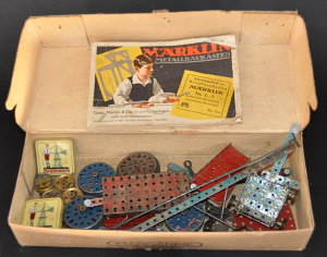 Metallbaukasten mit Anleitung, Bau- und Konstruktionsteilen und kleinen Werkzeugen. Der Karton ist nicht mehr original, sondern eine Margarineverpackung. Zwei aneinandergeschraubte lange Lochstangen (Länge 34 cm, Breite 1,3 cm) gehören vermutlich nicht zur Originalausstattung.