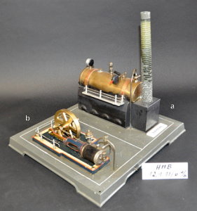 Funktionsfähiges Modell einer Dampfmaschine mit Messingkessel, Sicherheitsventil, feststehendem Zylinder, Dampfpfeife und Dampfstrahlzylinderölung (siehe Stukenbrok, S. 128) und Kamin mit Schornstein. Dampfmaschine und Antriebsrad sind nebeneinander auf einer flachen, rauen, rechteckigen Metallplatte befestigt. Brenneinschub sehr wahrscheinlich nicht original, sondern selbstgebaut (Umstellung von Lampenöl mit Docht auf Esbit). Die Funktion ist nicht mehr gegeben, da die Wassereinfüllung und der Ablass festsitzen. Die Füllstandanzeige ist defekt.