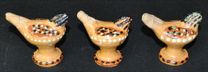 Tonpfeifen in Vogelform mit einer Heinzelmannfigur als Kopf. Goldfarbener Körper. Die Figur ist rot, blau und grau angemalt. Um den Figuransatz herum befindet sich das gestempelte Motiv.