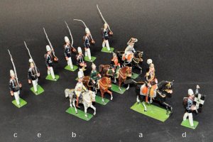 Zu c): Infanteristen mit weißer Hose und schwarzblauem Rock. Pickelhauben mit Federbüschen und Feldgepäck. Einer hält eine Fanfare oder Trompete, ein anderer trägt die Fahne, der Rest ist mit Gewehren samt Bajonett bewaffnet.